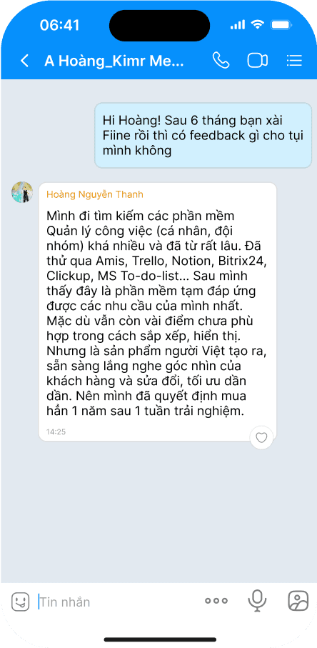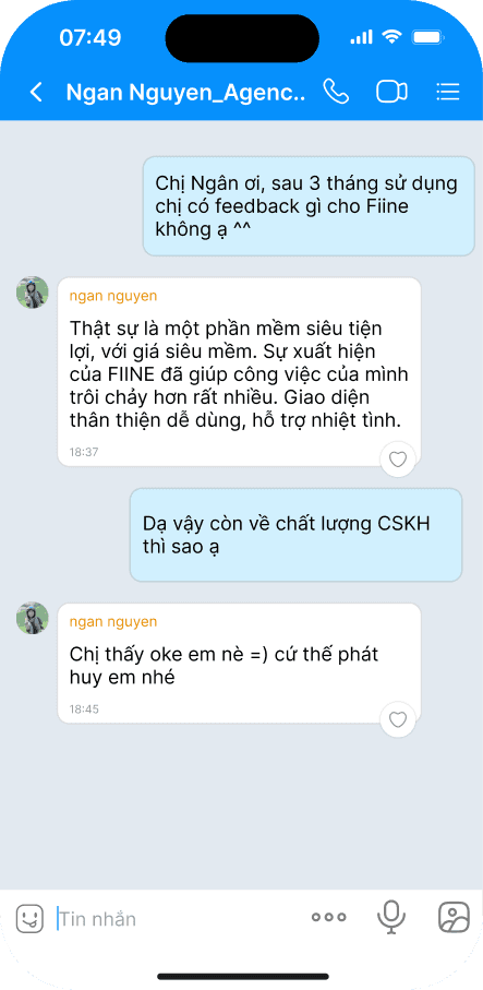 Thú thật là bên mình từng tốn tiền mua mấy phần mềm nước ngoài xịn sò lắm, nhưng dùng được 2 tuần là bỏ xó vì quá phức tạp, nhân viên lười nhập liệu. Gặp được Fiine đúng là chân ái vì giao diện thuần Việt, cực kỳ đơn giản. Các bạn mới vào trainning tầm 15 phút là biết dùng luôn. Không cần phải set-up rườm rà như mấy bên khác